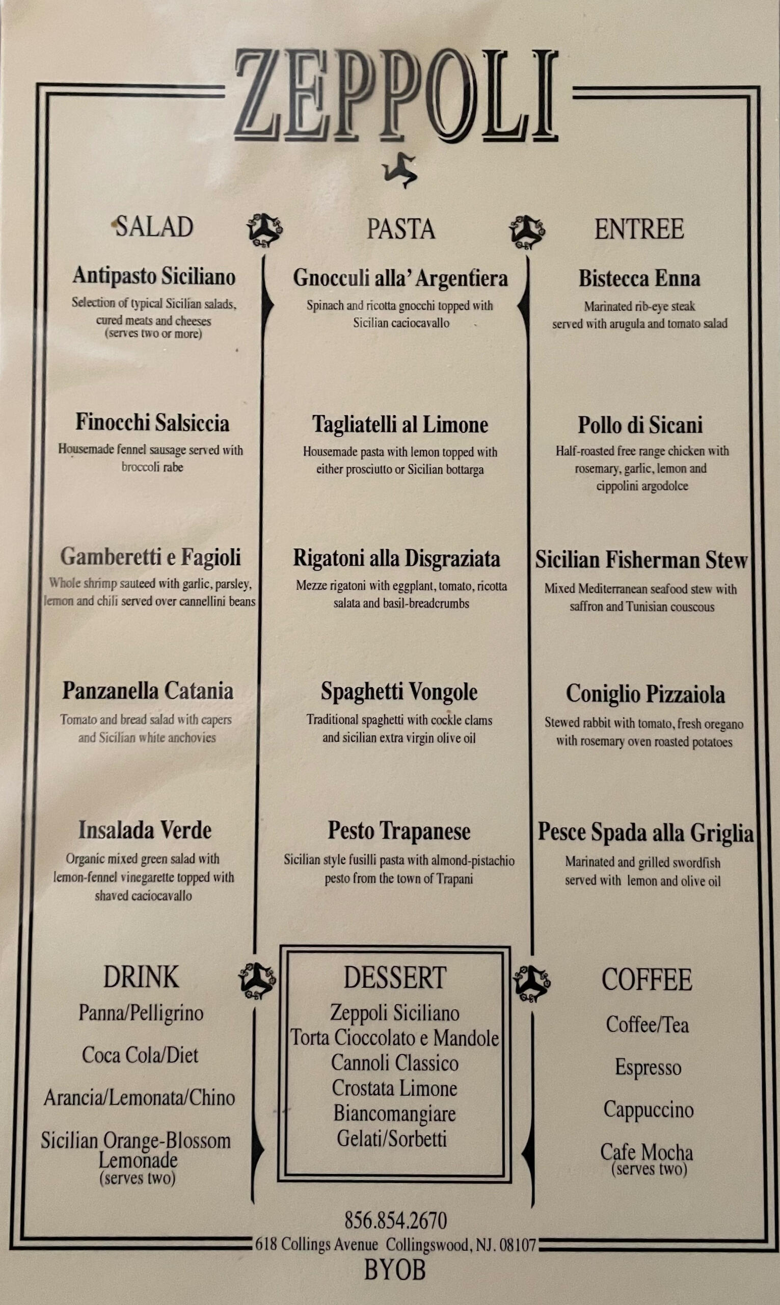 Opened in 2011, Zeppoli is a small romantic and very intimate 35 seat BYOB restaurant located in Collingswood NJ. Our Restaurant serves Classic yet very simple, Italian cuisine with a strong focus on Sicilian. Combining New and Old World traditions, you can choose from Antipasti, homemade/imported pastas, grilled or roasted meats, and fish, as well as house made desserts and Gelati.The name "Zeppoli" or Zeppole refers to "fried dough". These fried dough balls can either be savory or sweet. In the South of Italy and especially in Sicily, Zeppoli are also known as sfigne or St. Joseph's day cakes. These small Italian style doughnuts are either tossed in cinnamon/sugar, rolled with honey, or filled with sweetened fresh ricotta.Surrounded by old black and white photos of Sicily and dark wooden walls, guests can relax and enjoy authentic flavors of the Mediterranean.